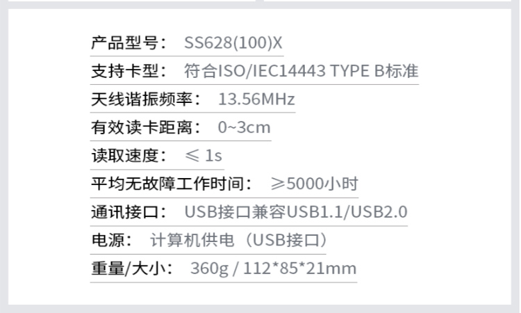 (*由于產(chǎn)品升級或其他原因,神思SS628-100X身份證閱讀器產(chǎn)品實際參數(shù)有可能變更,以實際產(chǎn)品為準(zhǔn)。本文中的所有陳述、信息和建議也不構(gòu)成任何明示或暗示的擔(dān)保)