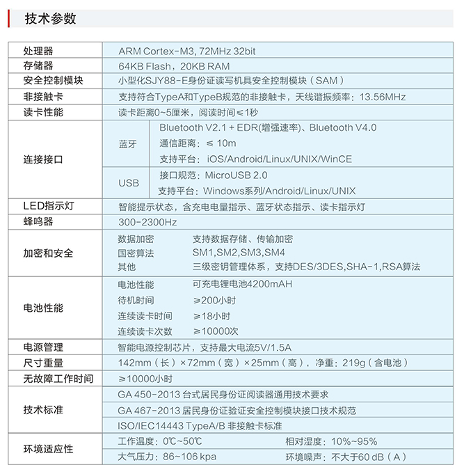 IDR240產品內置公安部授權的小型化SJYY88-E身份證讀寫機具安全控制模塊(SAM)和藍牙模塊,可讀取居民身份證信息,通過藍牙或USB接口上傳到計算機進行解碼,實現居民身份證的有效性驗證、存儲、查詢和打印,支持核查名單提示。可對接各類業務系統,可兼容讀寫其他行業定制的基于TypeA、TypeB規范的行業非接觸卡。內置大容量高能鋰電池,支持快速充電,智能電源管理提升續航能力。