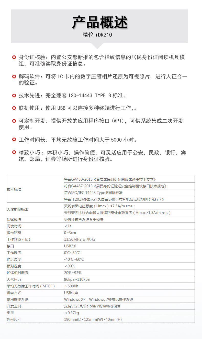 (*由于產品升級或其他原因,精倫IDR210身份證閱讀器產品實際參數有可能變更,以實際產品為準。本文中的所有陳述、信息和建議也不構成任何明示或暗示的擔保)