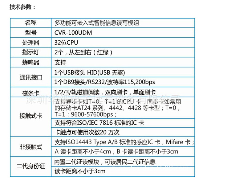 (*由于產品升級或其他原因,華視CVR-100UDM身份證閱讀器模組產品實際參數有可能變更,以實際產品為準。本文中的所有陳述、信息和建議也不構成任何明示或暗示的擔保)