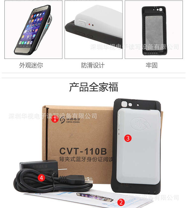 (*由于產品升級或其他原因,華視CVT-110B背夾式藍牙身份證閱讀機具產品實際參數有可能變更,以實際產品為準。本文中的所有陳述、信息和建議也不構成任何明示或暗示的擔保)