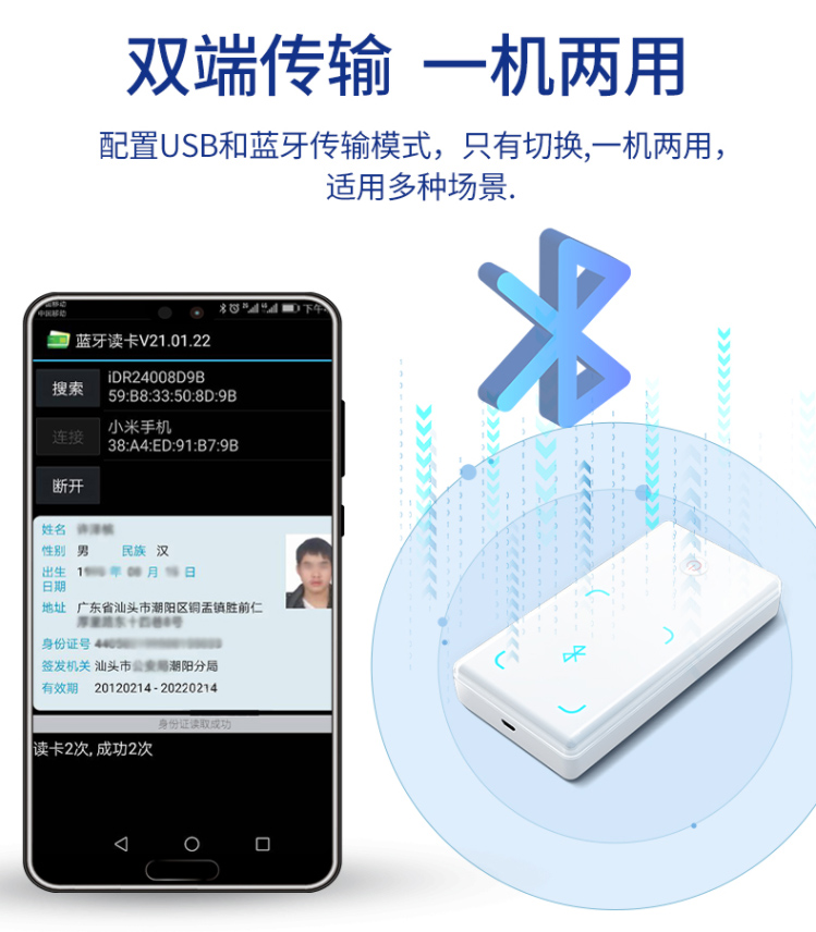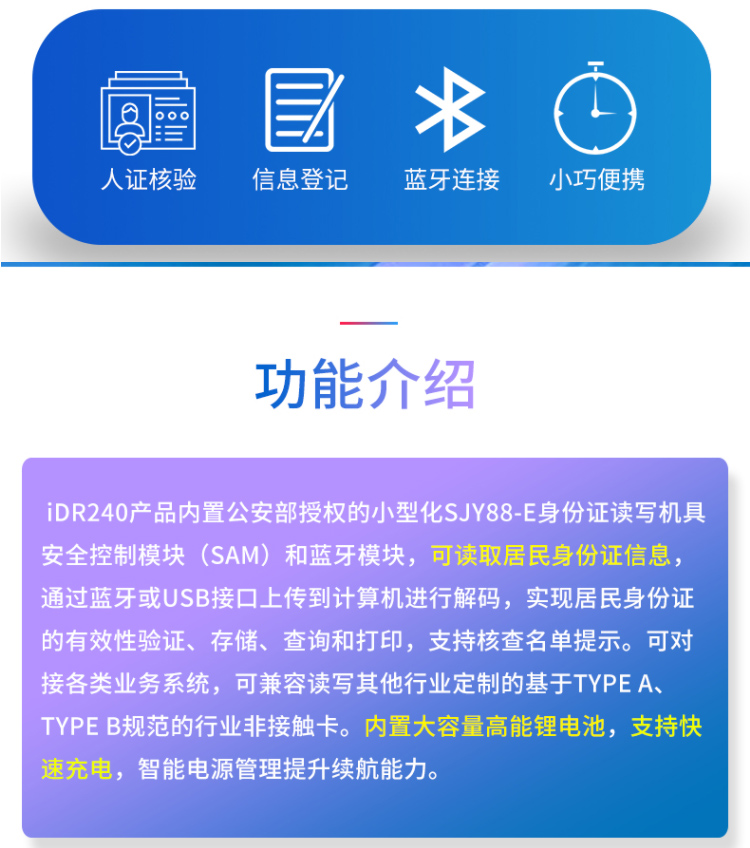 精倫Idr240產品是一款多功能射頻卡讀卡器,支持藍牙,有線雙端接入。產品內置公安部授權的身份證讀寫機具安全控制模塊(SAM)和藍牙模塊,可讀取居民身份證信息,通過藍牙或USB接口上床到計算機進行解碼,實現居民身份證有效性驗證,查詢和打印,支持核查名單提示??蓪痈黝悩I務系統,可兼容讀寫基于TypeA,TypeB規范的行業非接觸卡。內置大容量高能鋰電池,支持快速充電,只能電源管理提升續航能力。